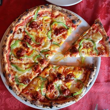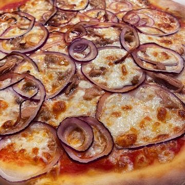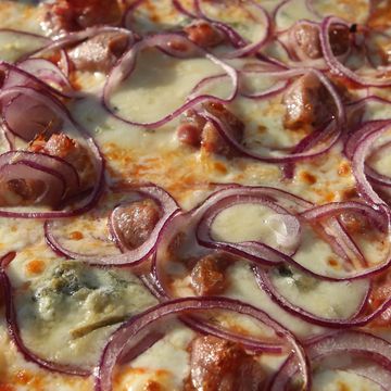 Tomate, mozzarella, gorgonzola, salchicha y cebolla roja