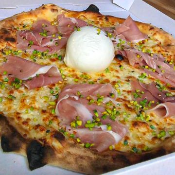 Mozzarella, mozzarella búfala, pistachos laminados, jamón parma