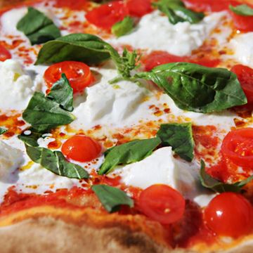 Massa de pizza, mozzarella de búfala, tomate cherry y albahaca
