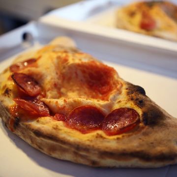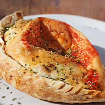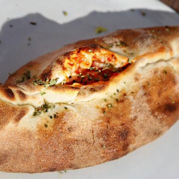 Massa de pizza rellena de queso provola, jamón york y tomate