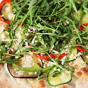 Masa de pizza, calabacín, berenjenas, pimiento, rúcula y parmesano